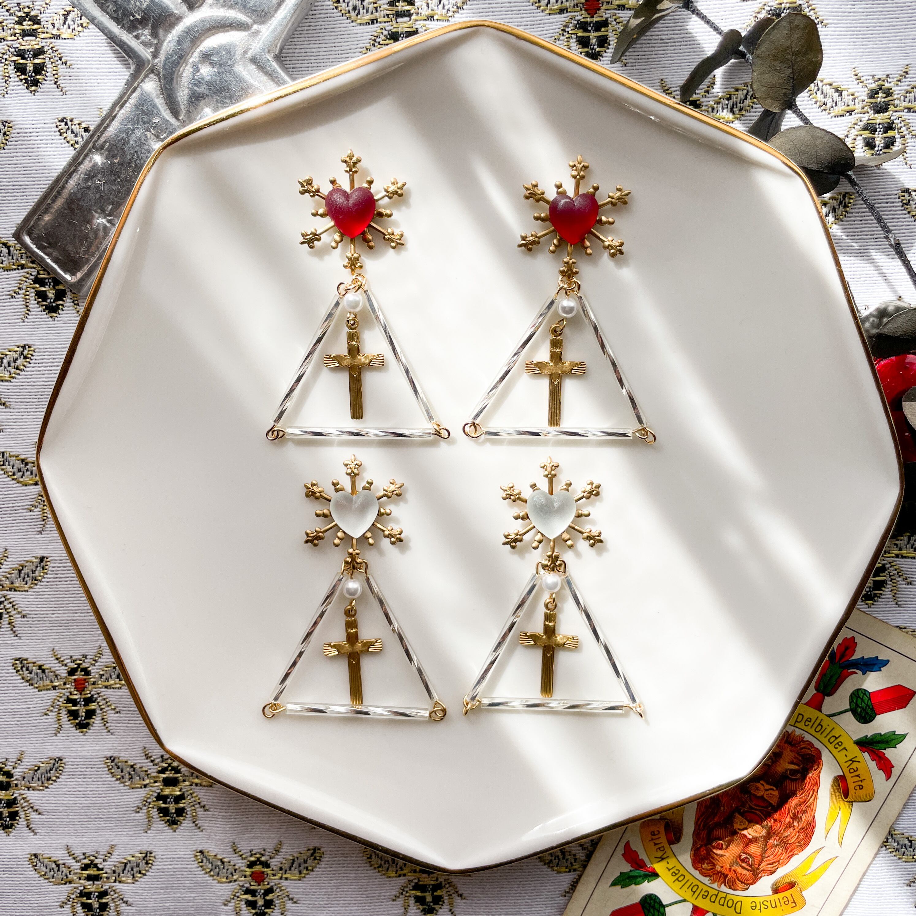 まるで花火のように広がる閃光のようなヴィンテージパーツの真ん中にガラスのハートをあしらった耳飾りです。ピアスの場合、トライアングルパーツはキャッチ部分に付属しているので、2WAYでお楽しみいただけます。