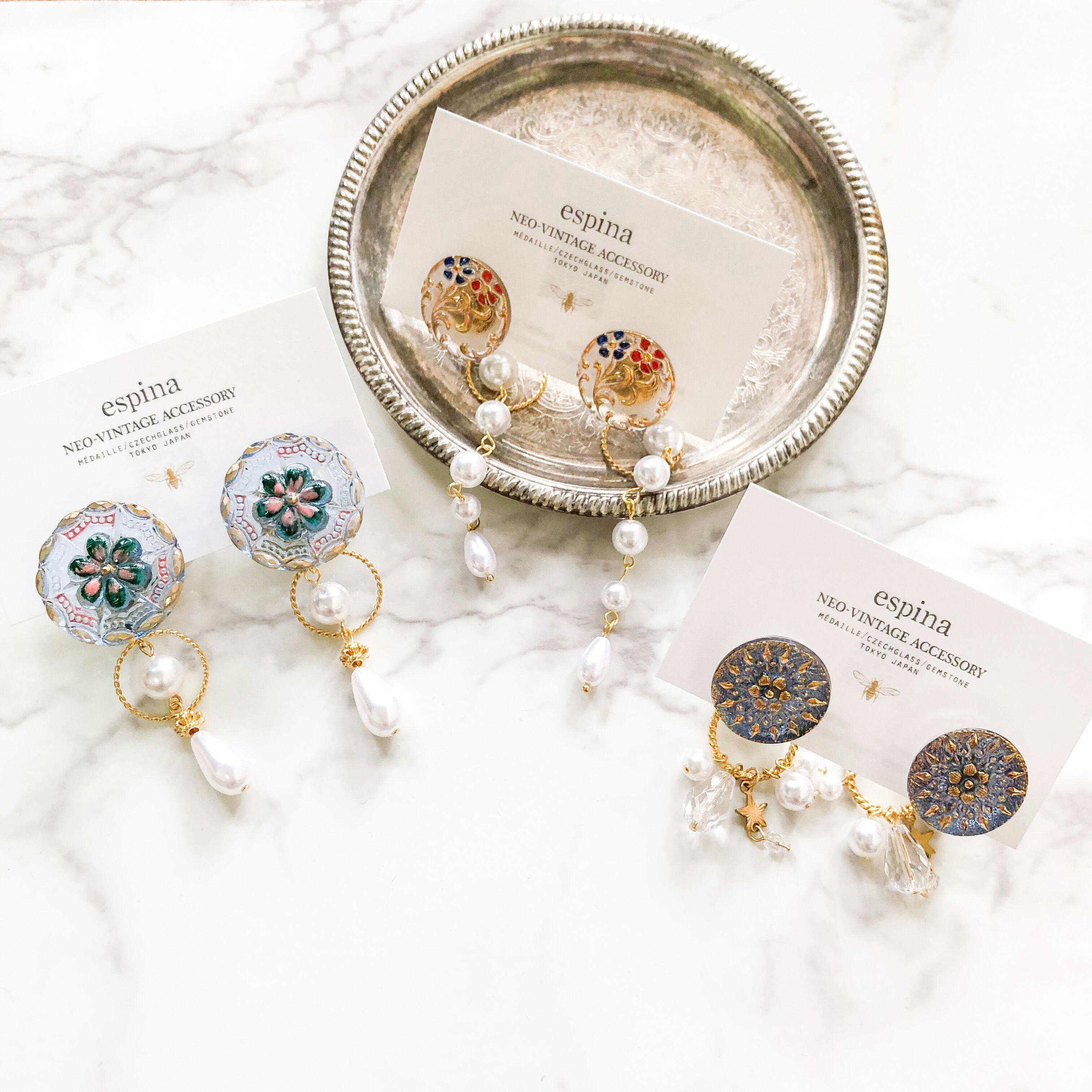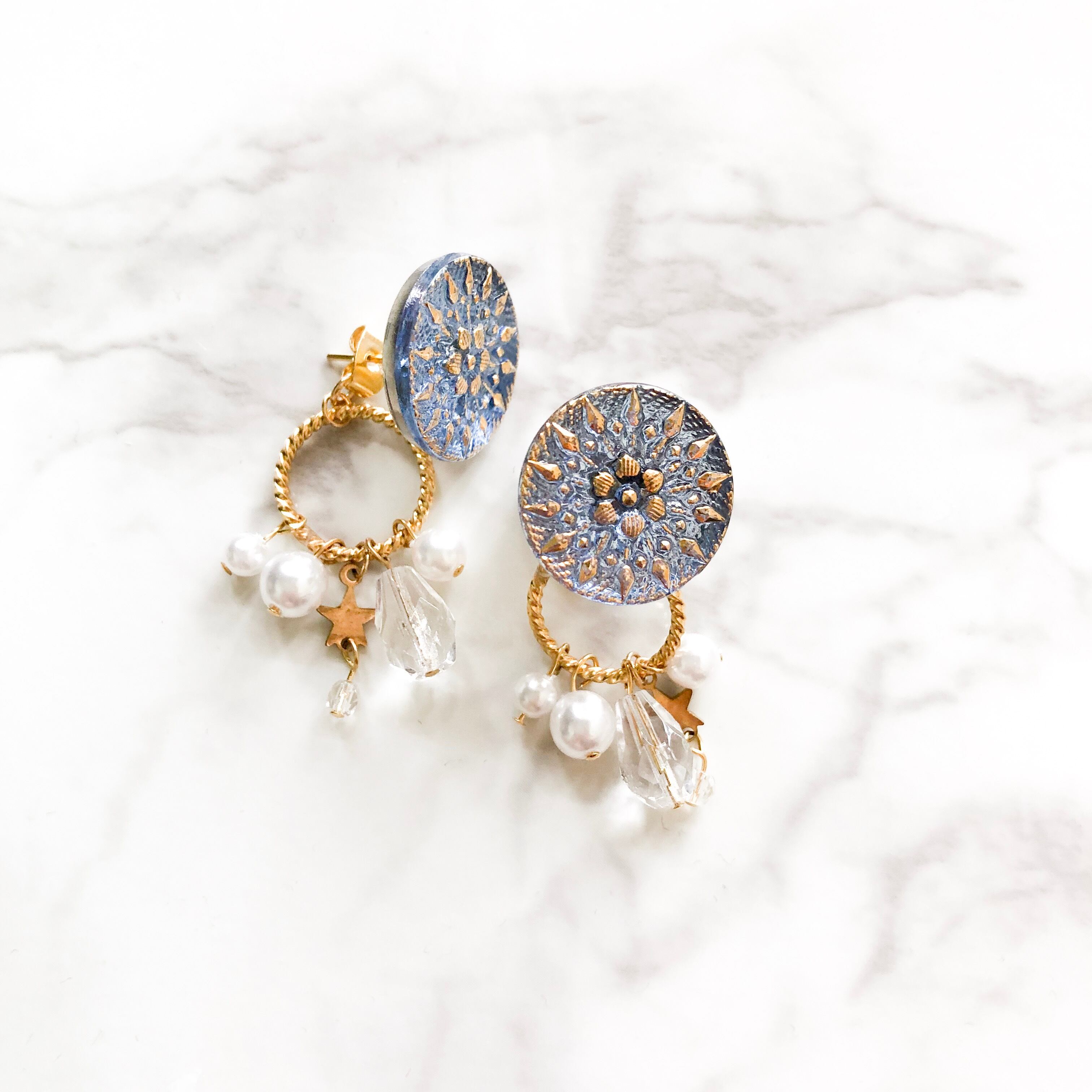 花火のような細やかな細工が施されたチェコ製のガラスボタンをリメイクしてピアスにしました。