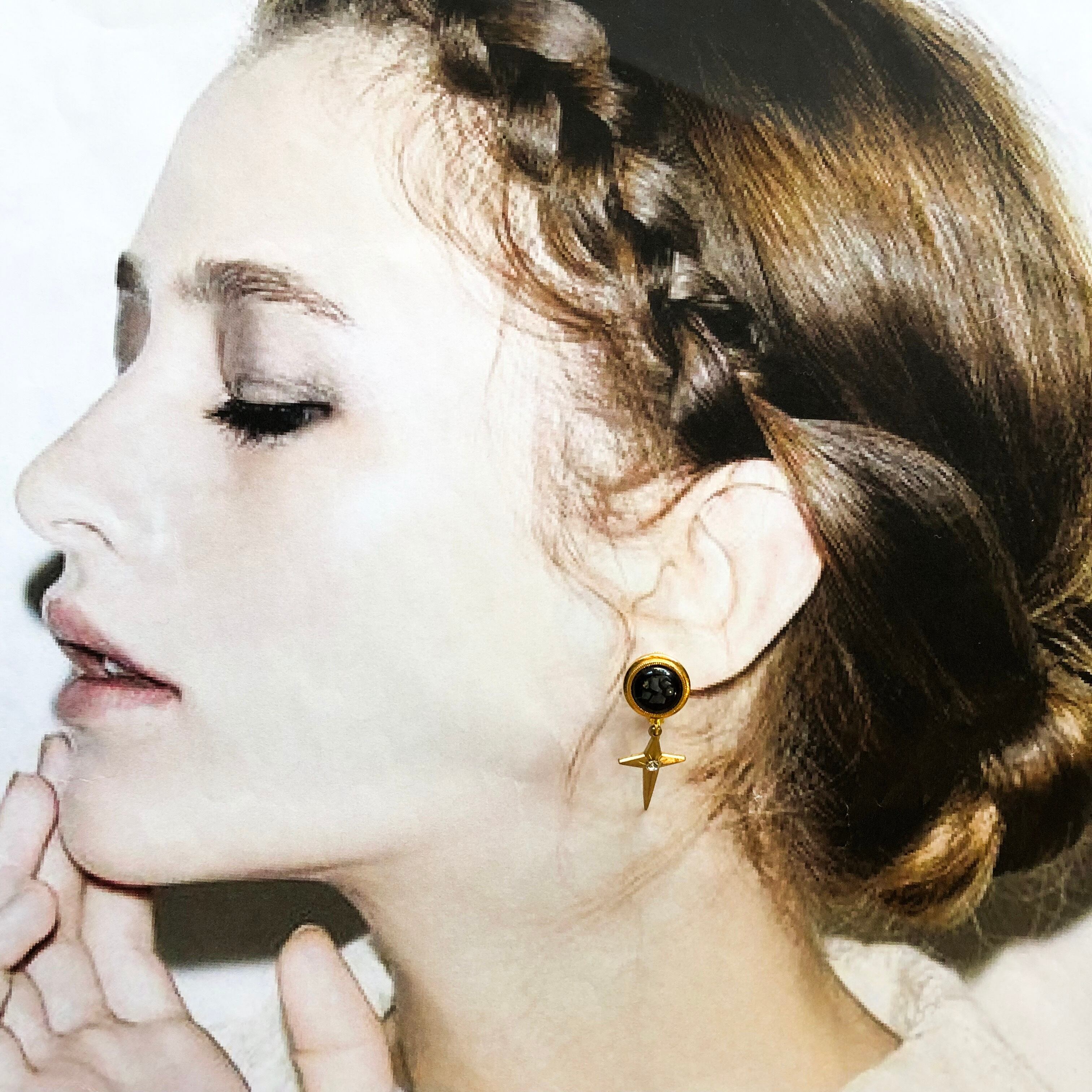 下にあしらったのは立体的な真鍮のクロスパーツ(こちらは現行品になります。ヴィンテージではありません)です。センターのクリスタルのスワロフスキーがポイントです。