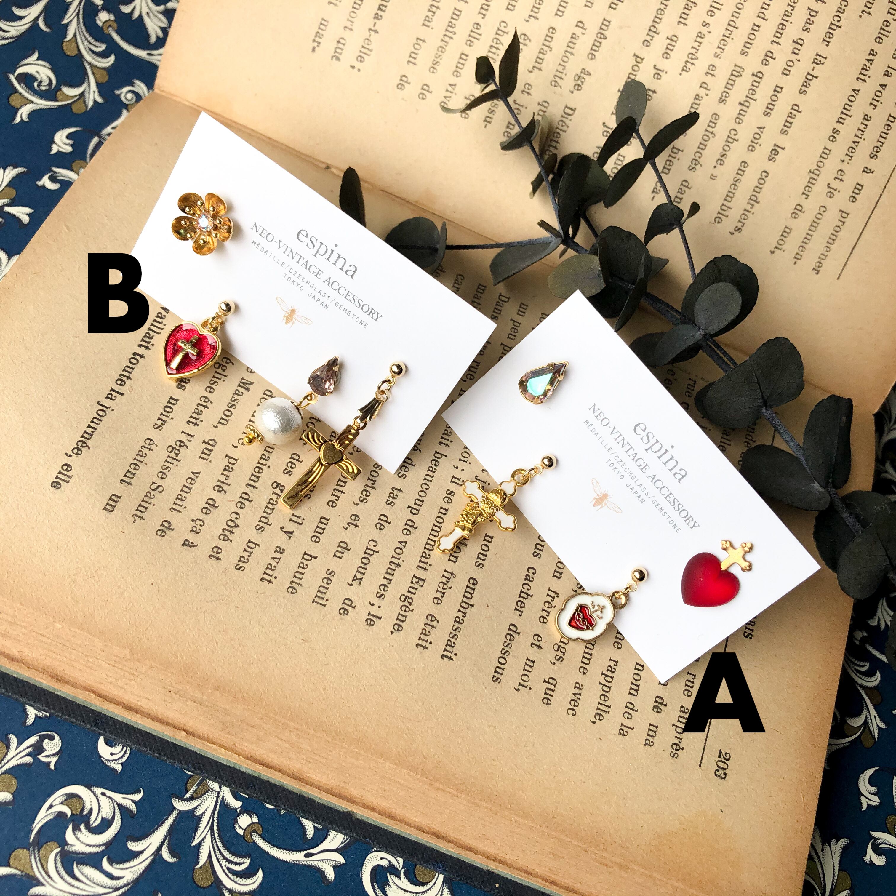 メダイやガラスのモチーフをちょこちょこっとまとめた嬉しい4点セットのピアスです。