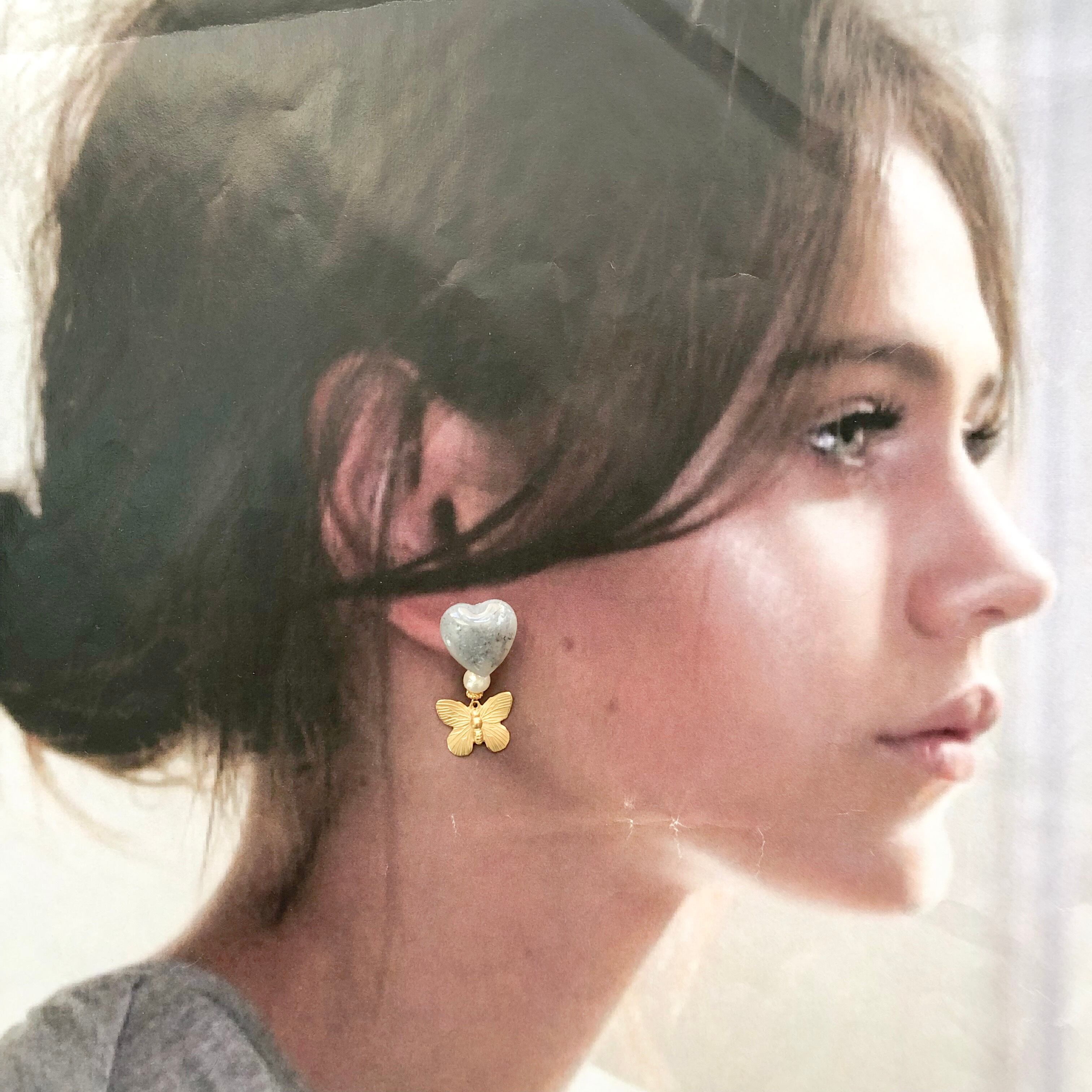 大理石風のハート型のカボションに、パールやブラスチャームをあしらった耳飾りです。