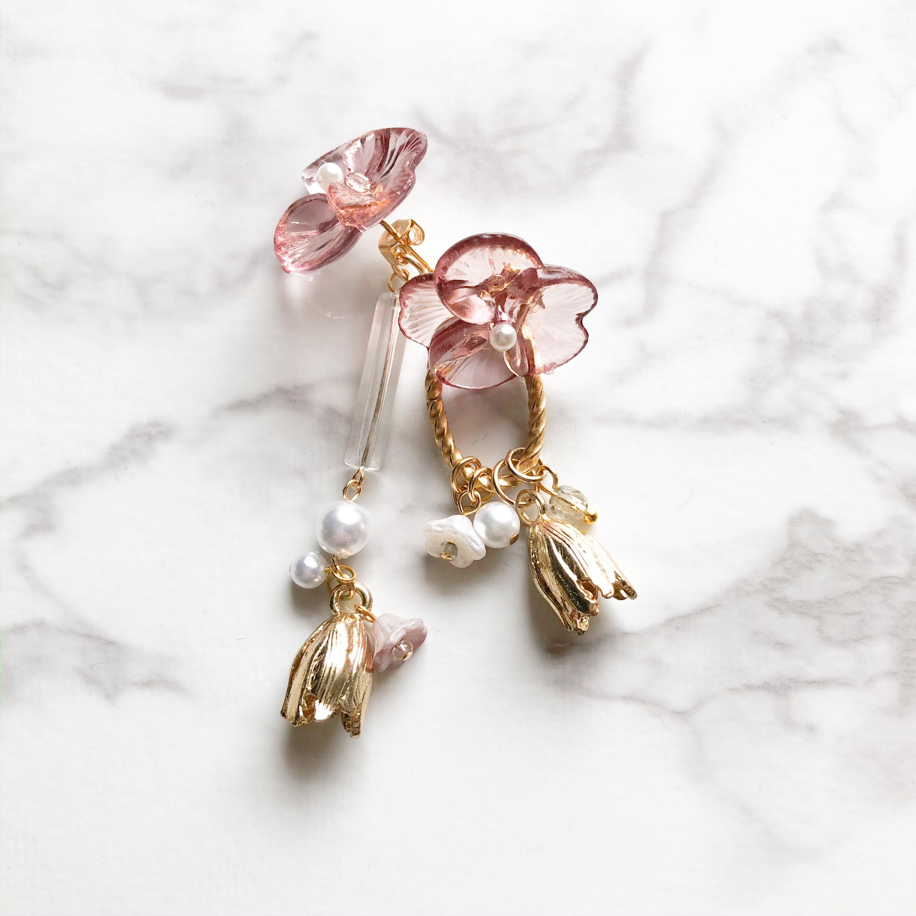 ヴィンテージカラーのクリアフラワーピアス
