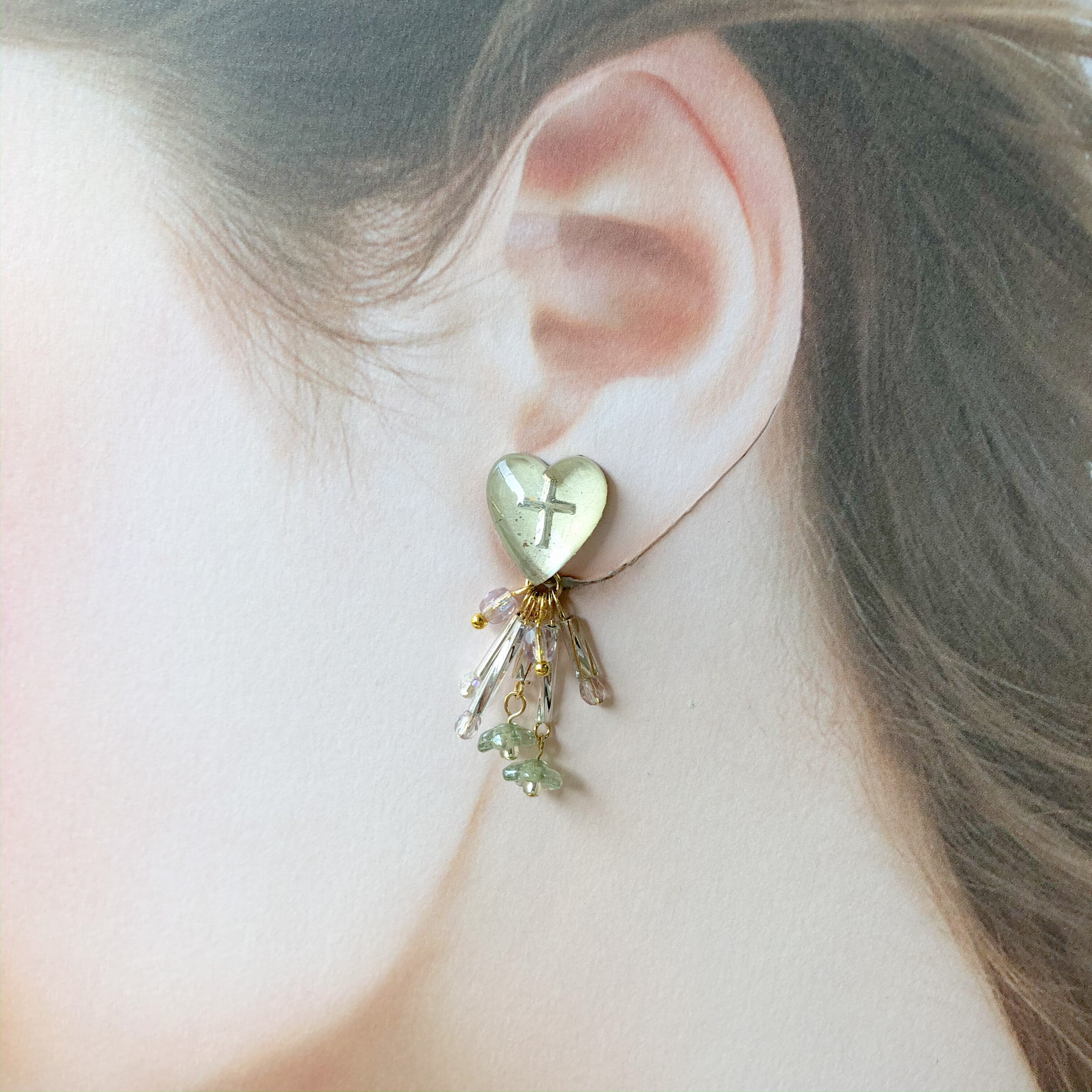 ハートインタリオカボションとガラスタッセルの耳飾り