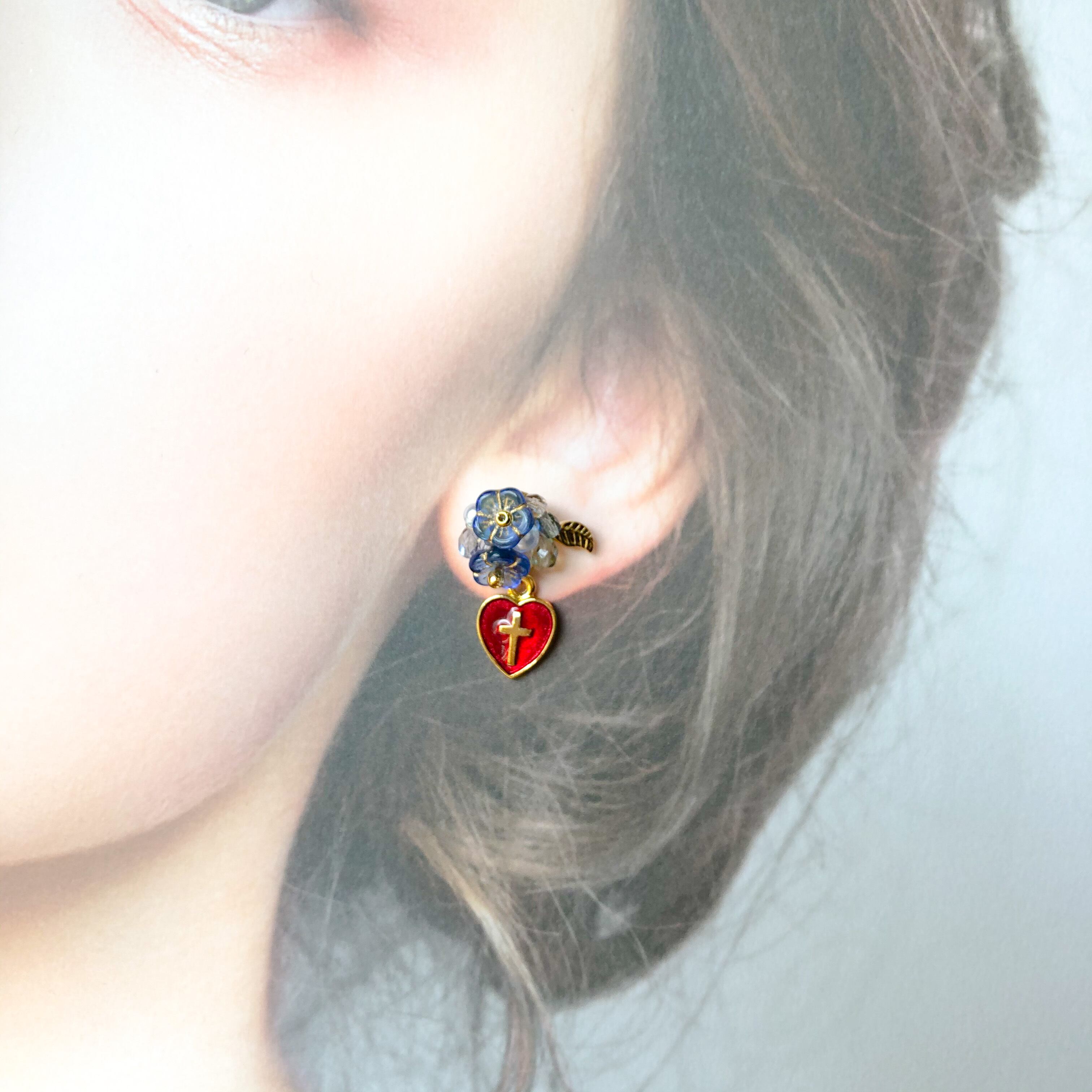 ブルーのガラスブーケとメダイのアシンメトリー耳飾り