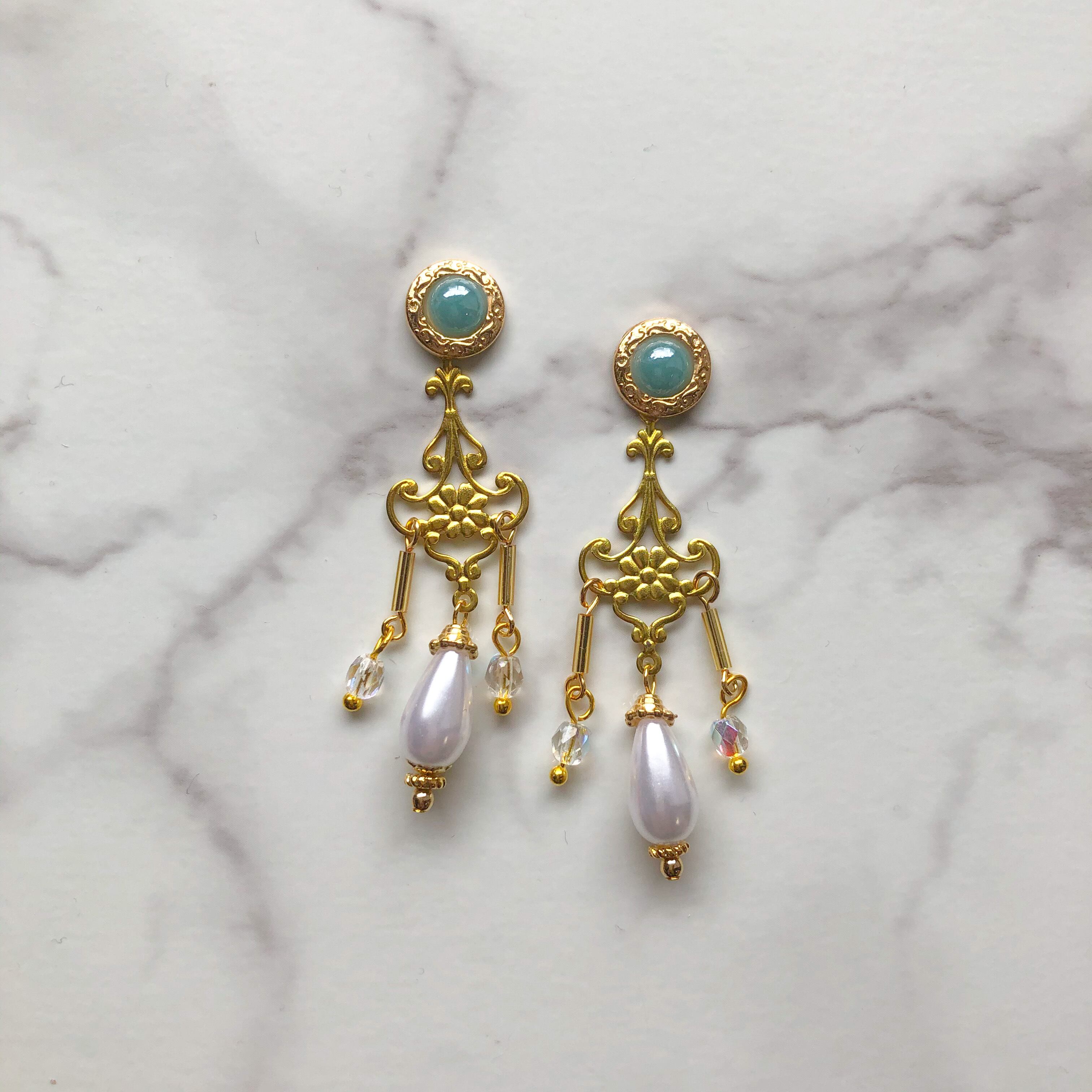 小さなティファニーカラーのボタンに、お花のロココなデザインのパーツとビーズでシャンデリアをイメージした耳飾りに仕上げました。