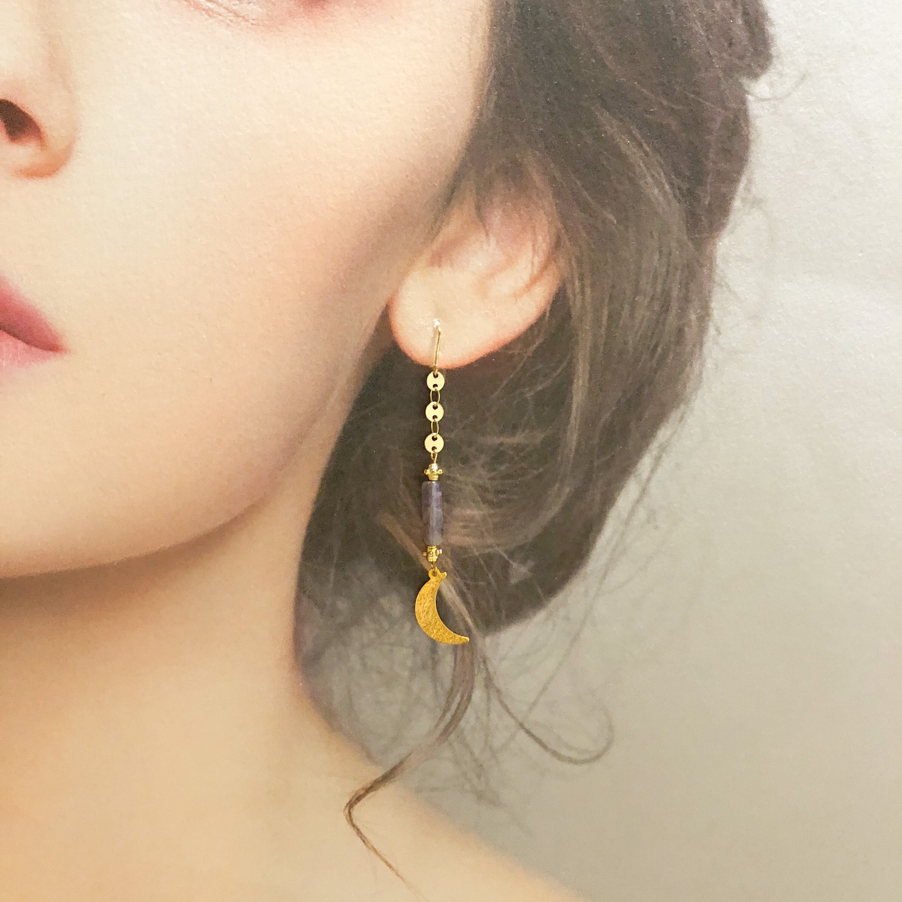 月と星のモチーフで左右まったく異なるデザインの耳飾りです。