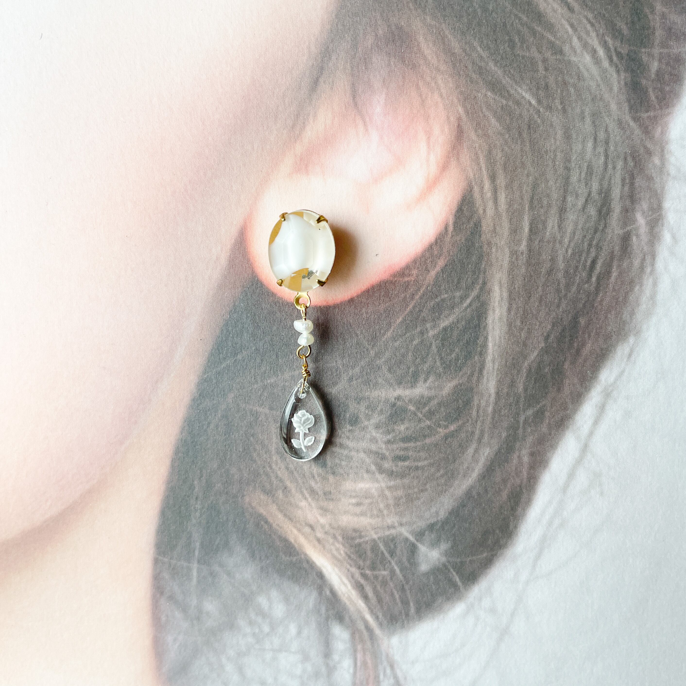 氷に閉じ込めたような美しいローズのインタリオが主役の耳飾り。