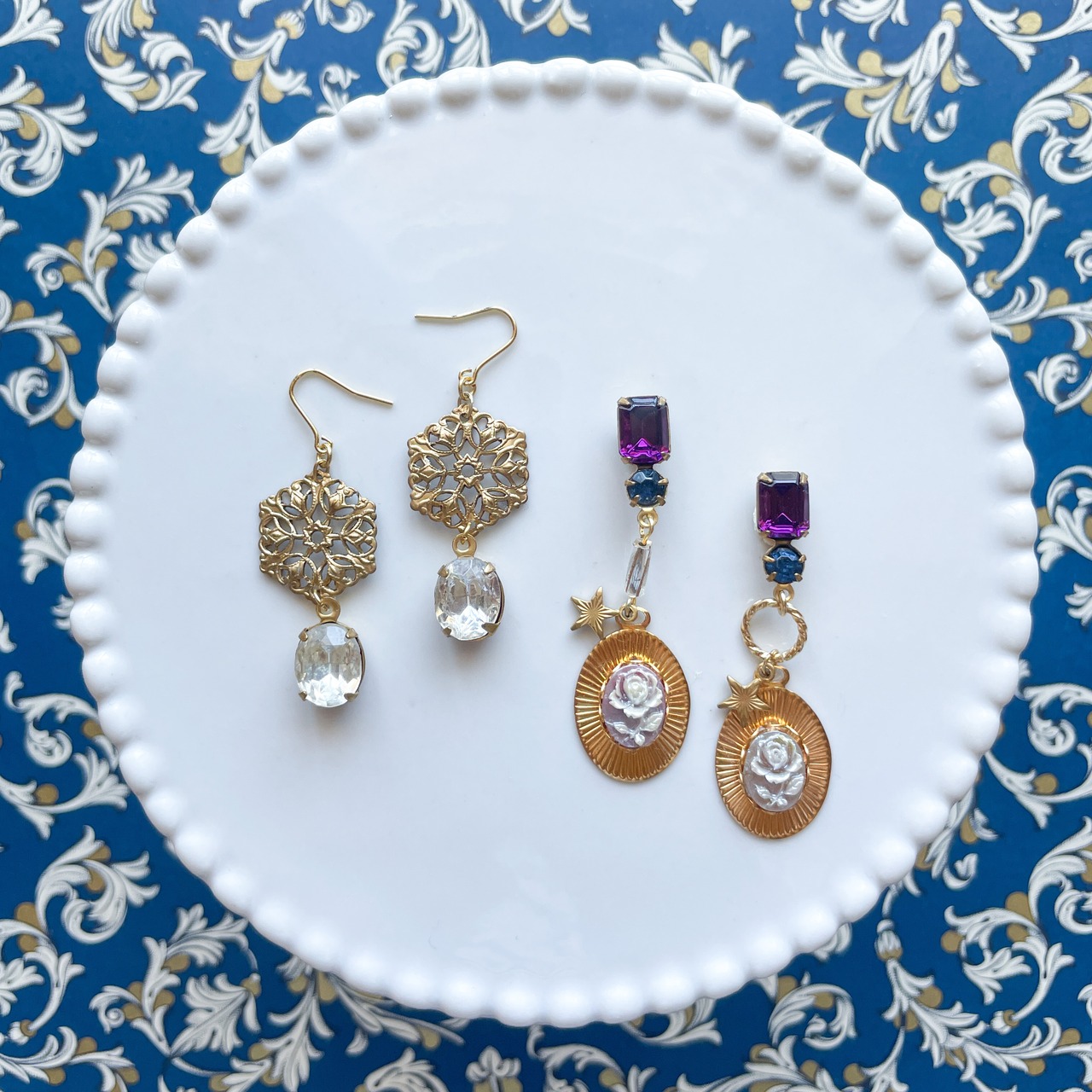 ヴィンテージガラスとアラベスクオクタゴンの耳飾り