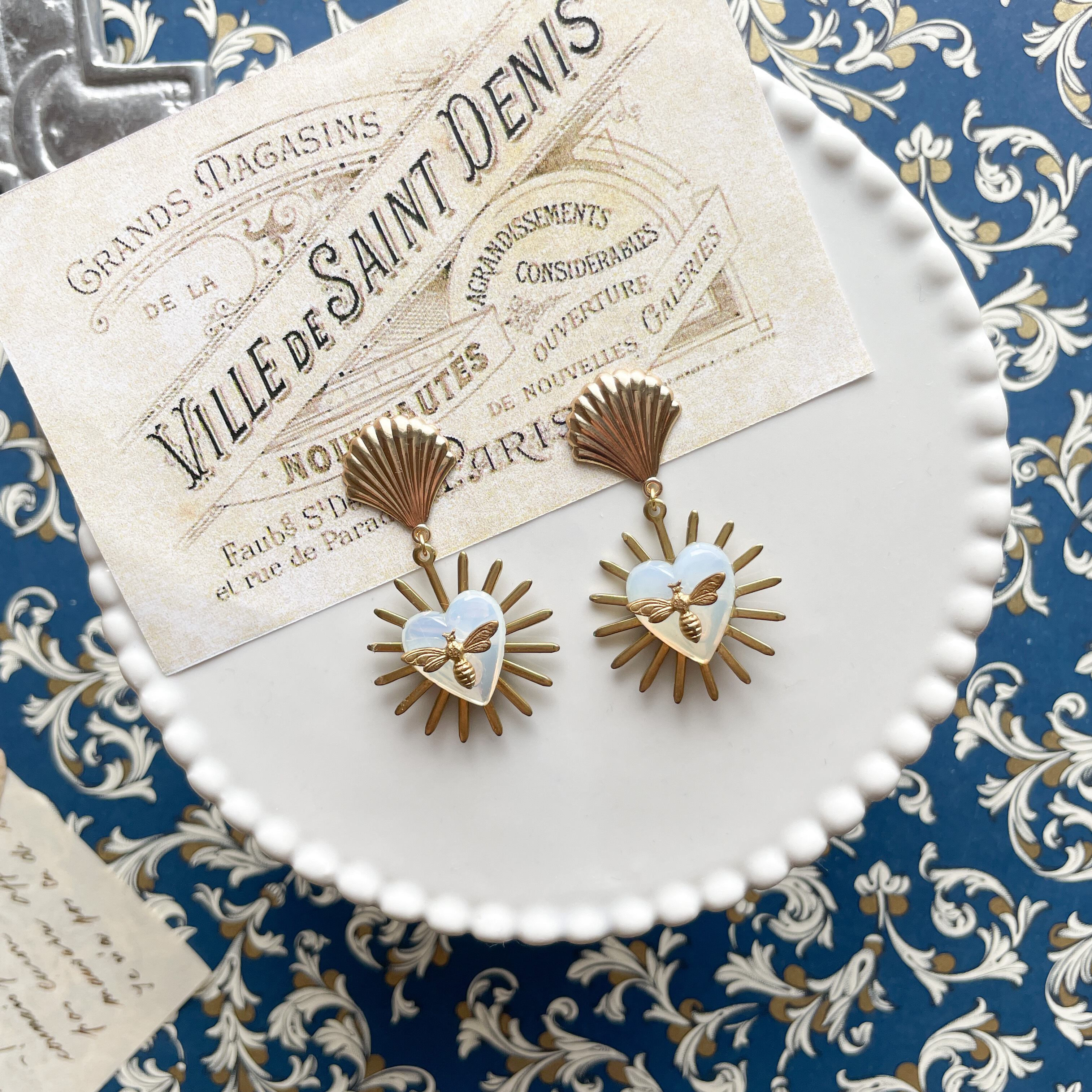 オパール風のホワイトガラスハートをコラソンのように見立てた耳飾り。