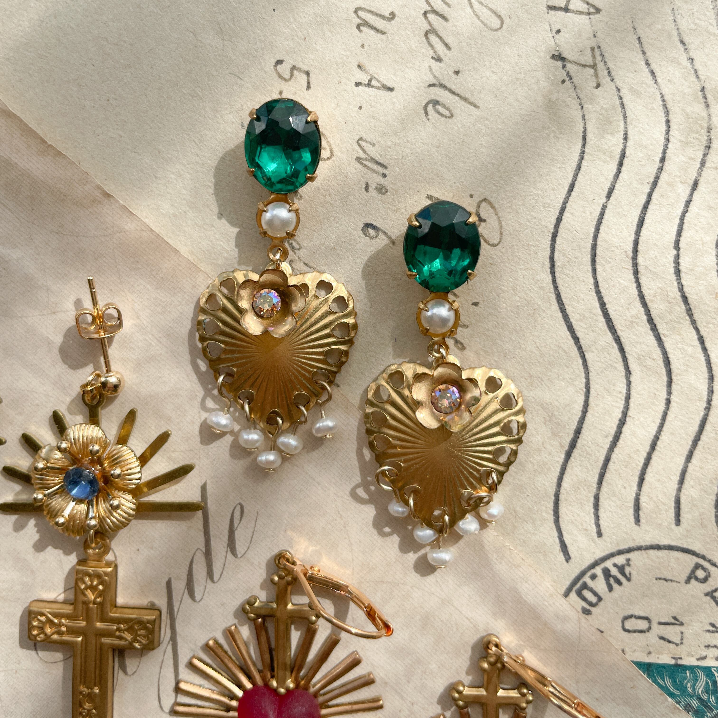 グリーンのヴィンテージガラスとハートのモチーフの耳飾りです。