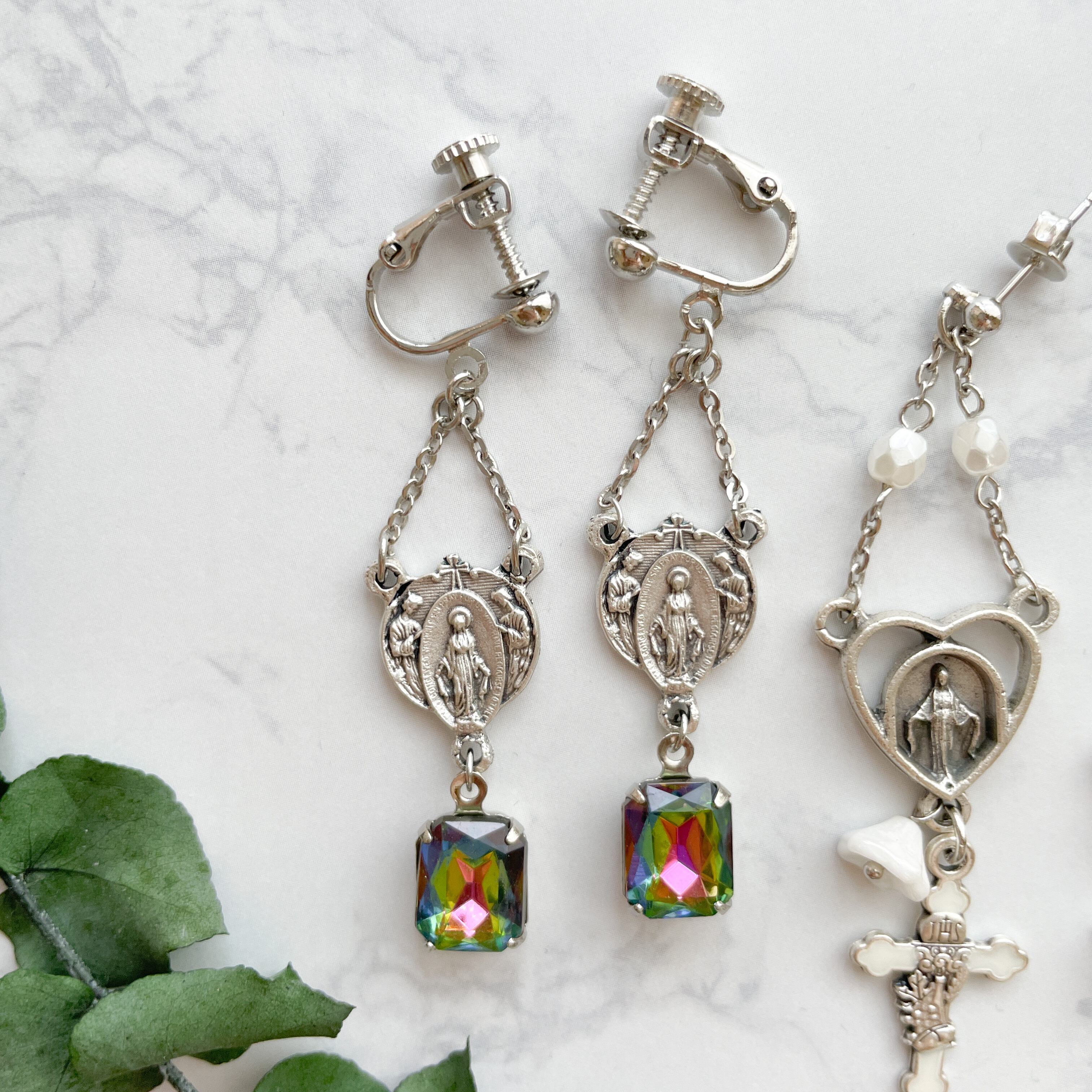 マリア様のレリーフが美しい、イタリア製のメダイを使用した耳飾りです。シルバーカラーでまとめているので、華やかさの中にもクールな印象がある耳飾りに仕上げています。