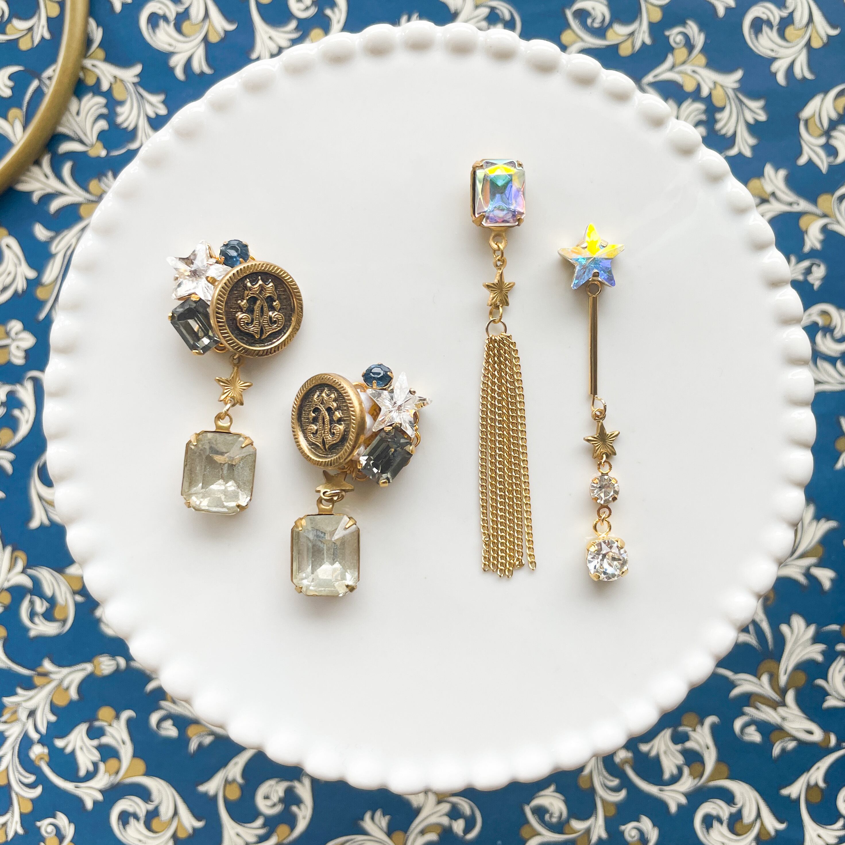 ヴィンテージガラスやスワロフスキーを贅沢に使用したアシンメトリーデザインの耳飾り。